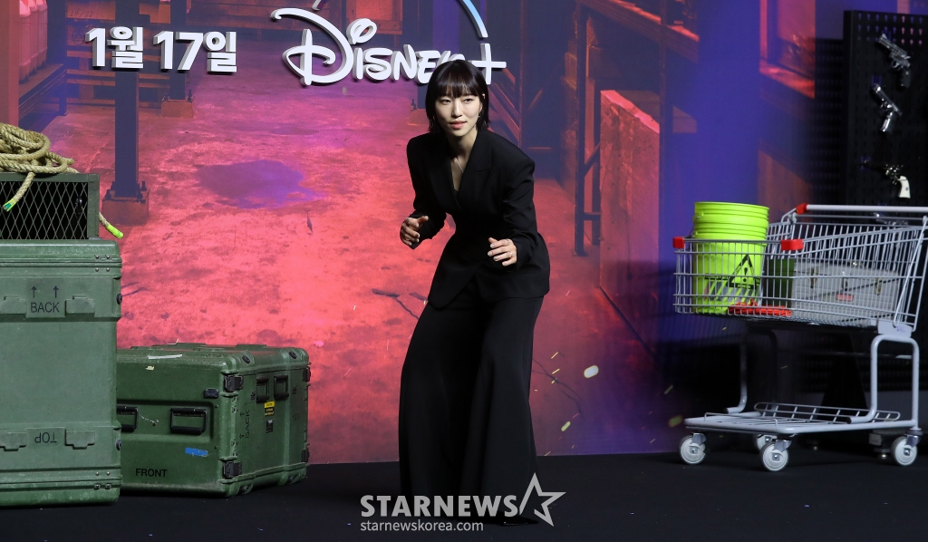 배우 금해나가 15일 오전 서울 영등포구 여의도동 콘래드 서울에서 진행된 디즈니+ 오리지널 시리즈 '킬러들의 쇼핑몰' 제작발표회에 참석해 포즈를 취하고 있다.