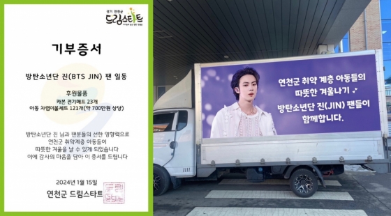 진의 국내 서포터즈인 '김석진 홍보팀'이 1월 12일 '연천군 드림스타트'(아동청소년센터·국가운영 기관)를 직접 방문해 700만 원 상당 '까나베나' 국내생산 친환경 비건인증 아동 차렵이불세트 121개와 카본 전기매트 23개를 전달했다.