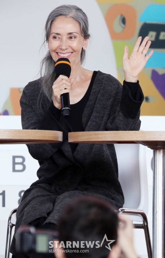 배우 문숙이 7일 오후 부산 해운대구 우동 영화의 전당 두레광장에서 진행된 영화 '허스토리' 무대인사에 참석해 인사말을 하고 있다. /사진=김휘선 기자 tndejrrh123@