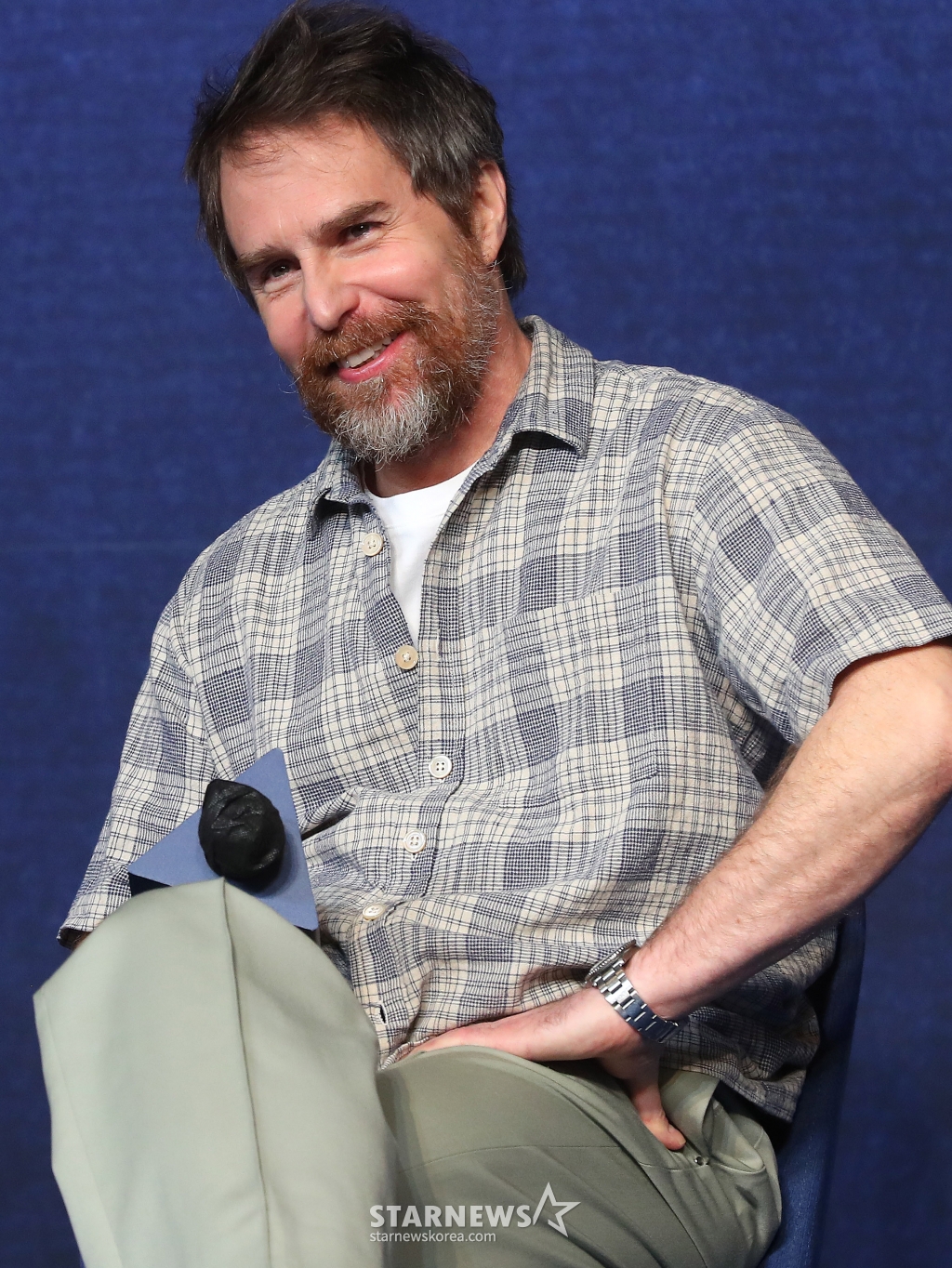 할리우드 배우 샘 록웰이 18일 오전 서울 종로구 포시즌스호텔 서울에서 진행된 할리우드 영화 '아가일' 내한 기자회견에서 미소를 짓고 있다.