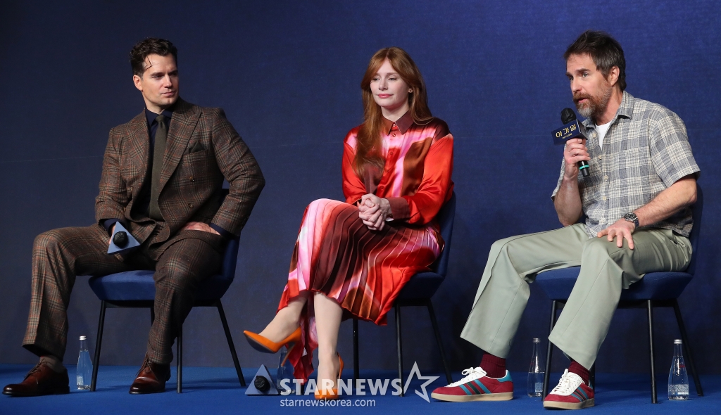 할리우드 배우 샘 록웰이 18일 오전 서울 종로구 포시즌스호텔 서울에서 진행된 할리우드 영화 '아가일' 내한 기자회견에서 취재진 질의에 답하고 있다.