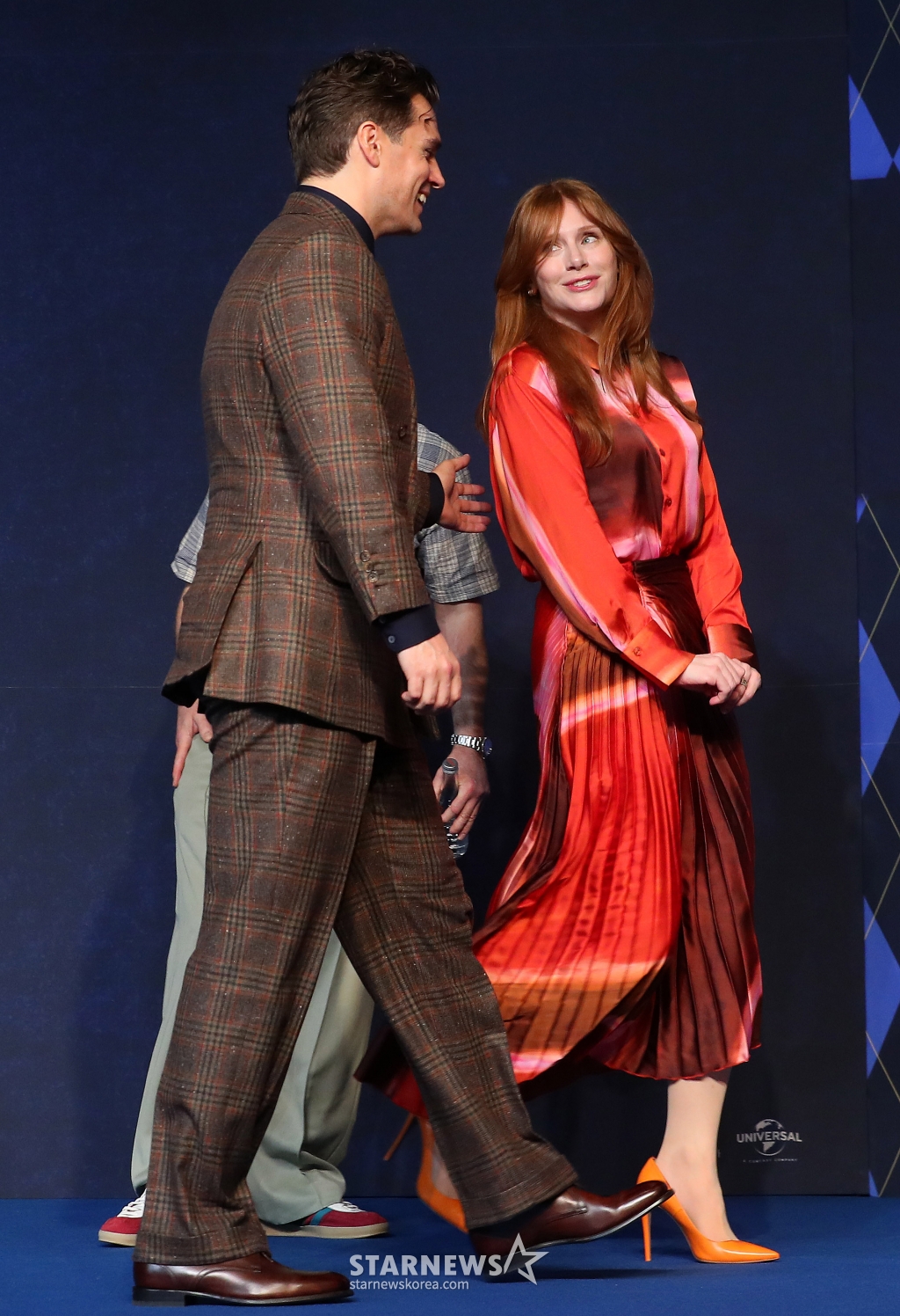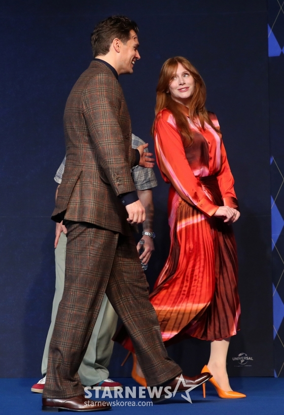 할리우드 배우 헨리 카빌, 브라이스 달라스 하워드가 18일 오전 서울 종로구 포시즌스호텔 서울에서 진행된 할리우드 영화 '아가일' 내한 기자회견을 마친 뒤 대화를 나누고 있다.