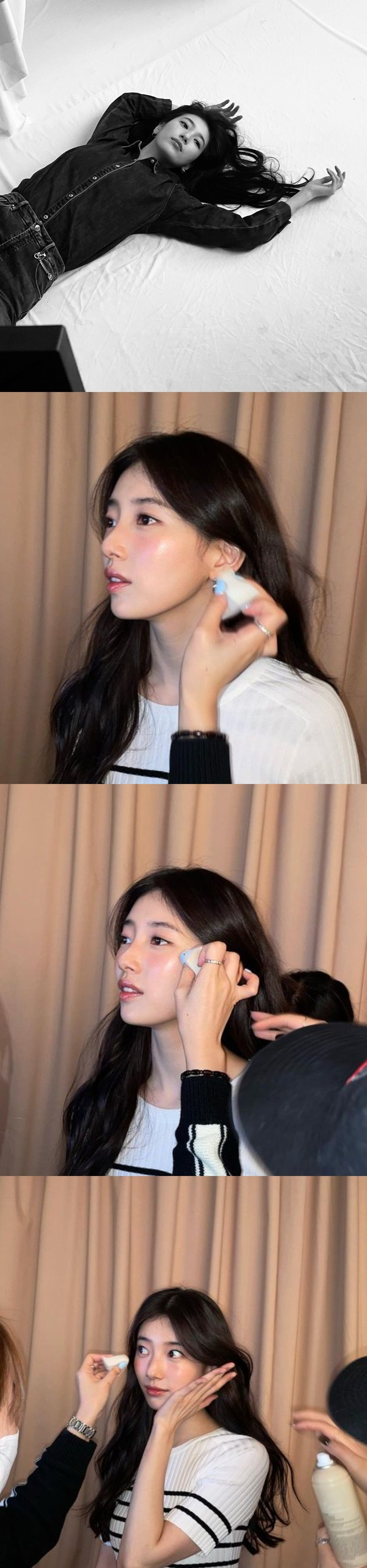가수 겸 배우 수지가 의류 브랜드 화보 촬영 현장에서 찍은 사진을 공개했다.