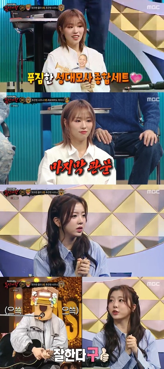 이날 '복면가왕'에서는 다민과 '카드병정'으로 가왕에 도전했던 원채가 함께 출연해 팬들의 시선이 집중됐다. 원채와 다민은 참가자 '후끈한 사우나', '희로애락도 락이다', '피자엔 콜라'의 무대를 감상하는가 하면, 리얼한 리액션으로 눈길을 사로잡았다.