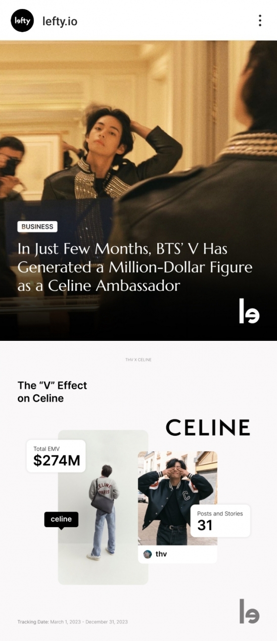 프랑스를 기반으로 한 인플루언서 마케팅 플랫폼 '레프티'(Lefty)는 뷔가 셀린느의 앰버서더로서 창출한 언드 미디어 가치(EMV/Earned media value)를 공개했다.