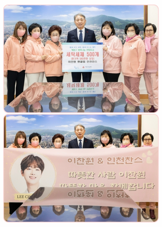 이찬원 팬클럽 '인천찬스'는 1월 24일 인천 계양구에 545만 원 상당 친환경 세제 '슈가버블' 500개를 기부했다.
