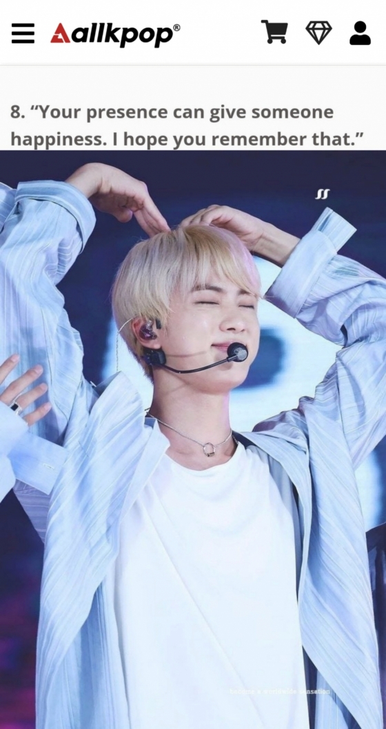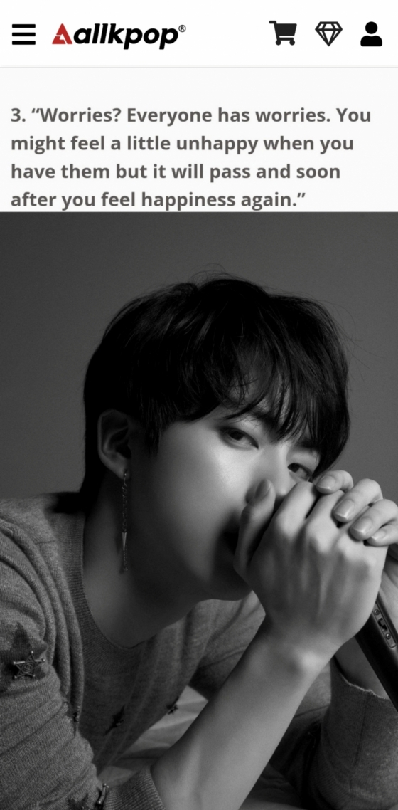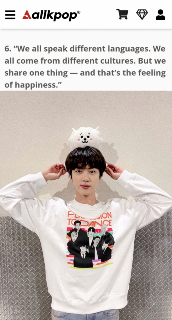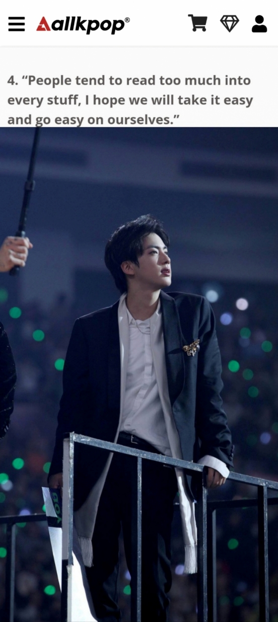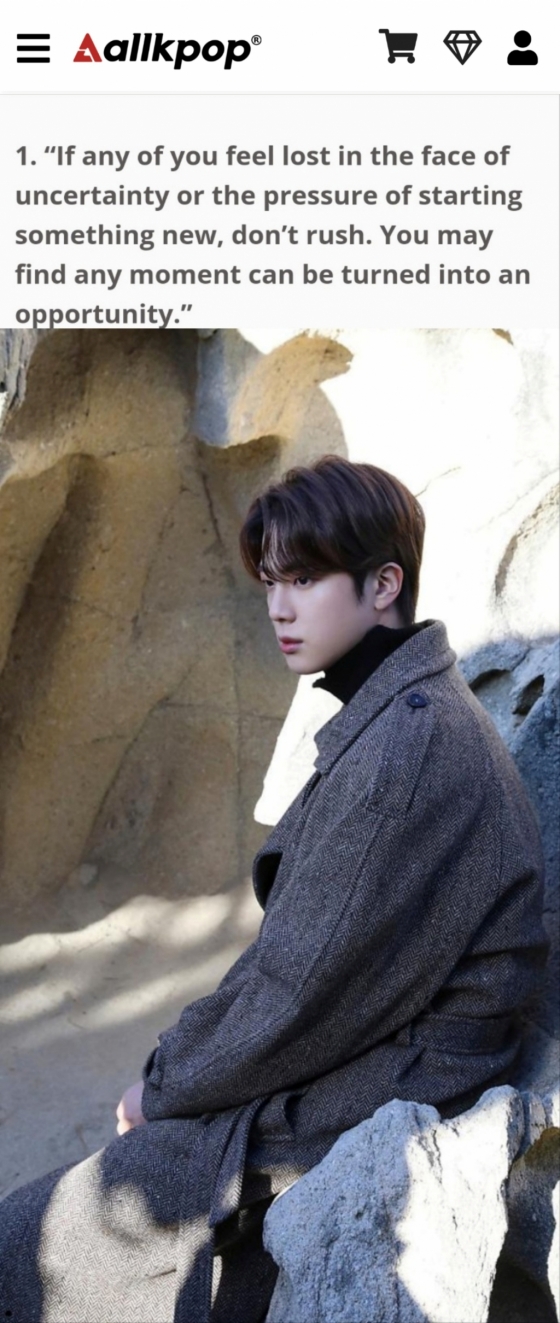 미국 연예 매체 올케이팝(Allkpop)은 최근 '당신을 미소 짓게 할 방탄소년단 김석진이 전하는 귀중한 명언'이라는 기사를 통해 진이 한 보석 같은 말들을 소개했다.
