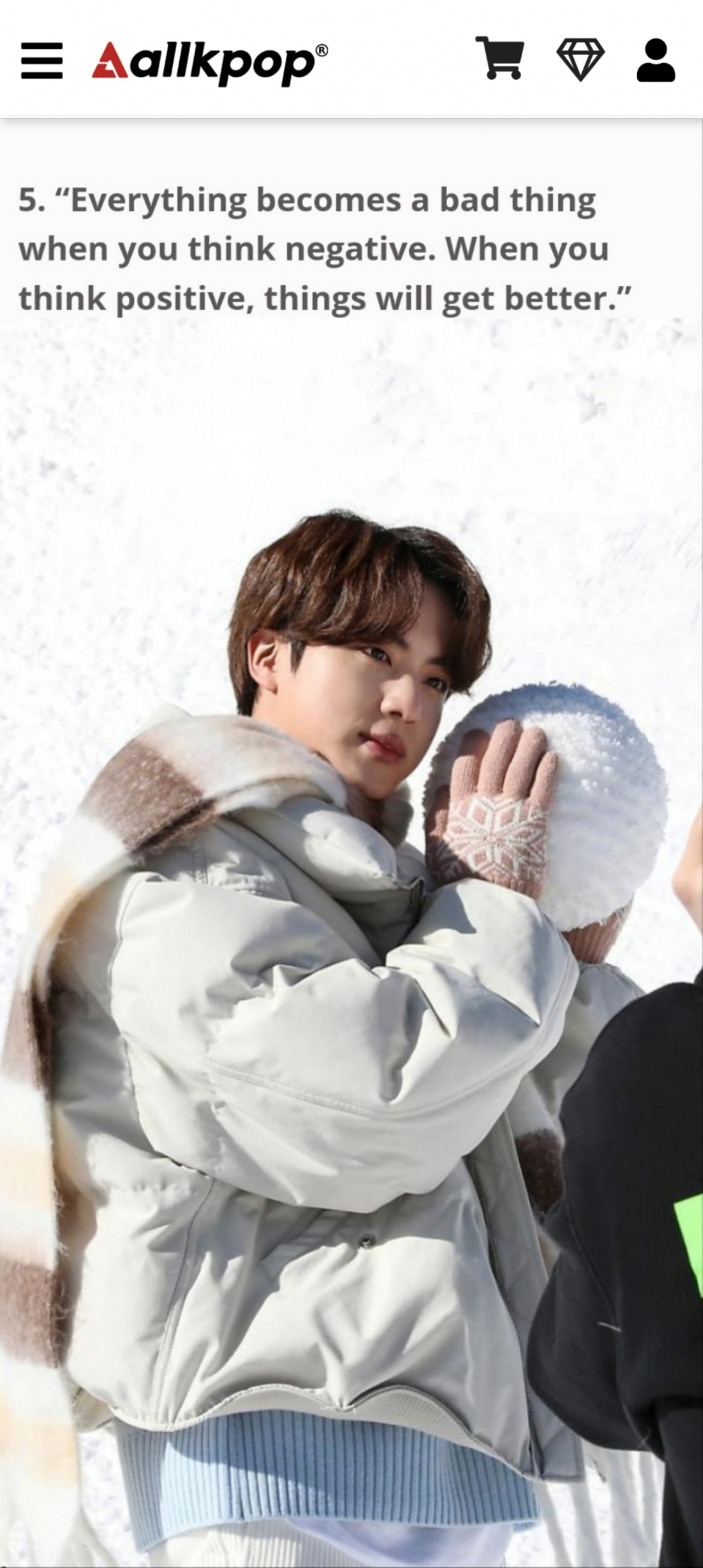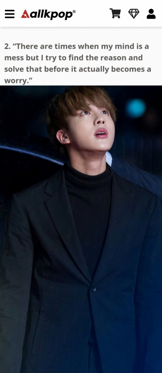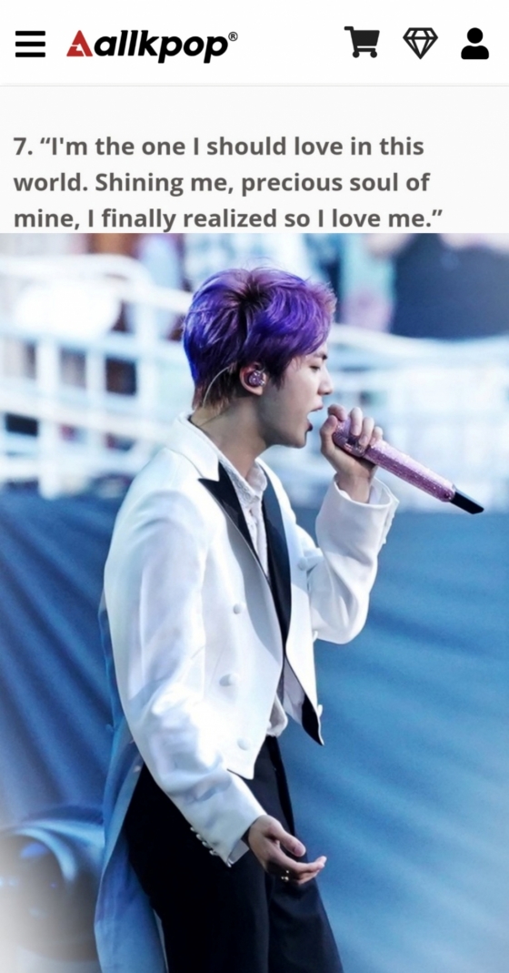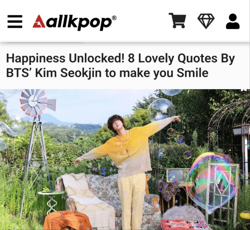 미국 연예 매체 올케이팝(Allkpop)은 최근 '당신을 미소 짓게 할 방탄소년단 김석진이 전하는 귀중한 명언'이라는 기사를 통해 진이 한 보석 같은 말들을 소개했다.