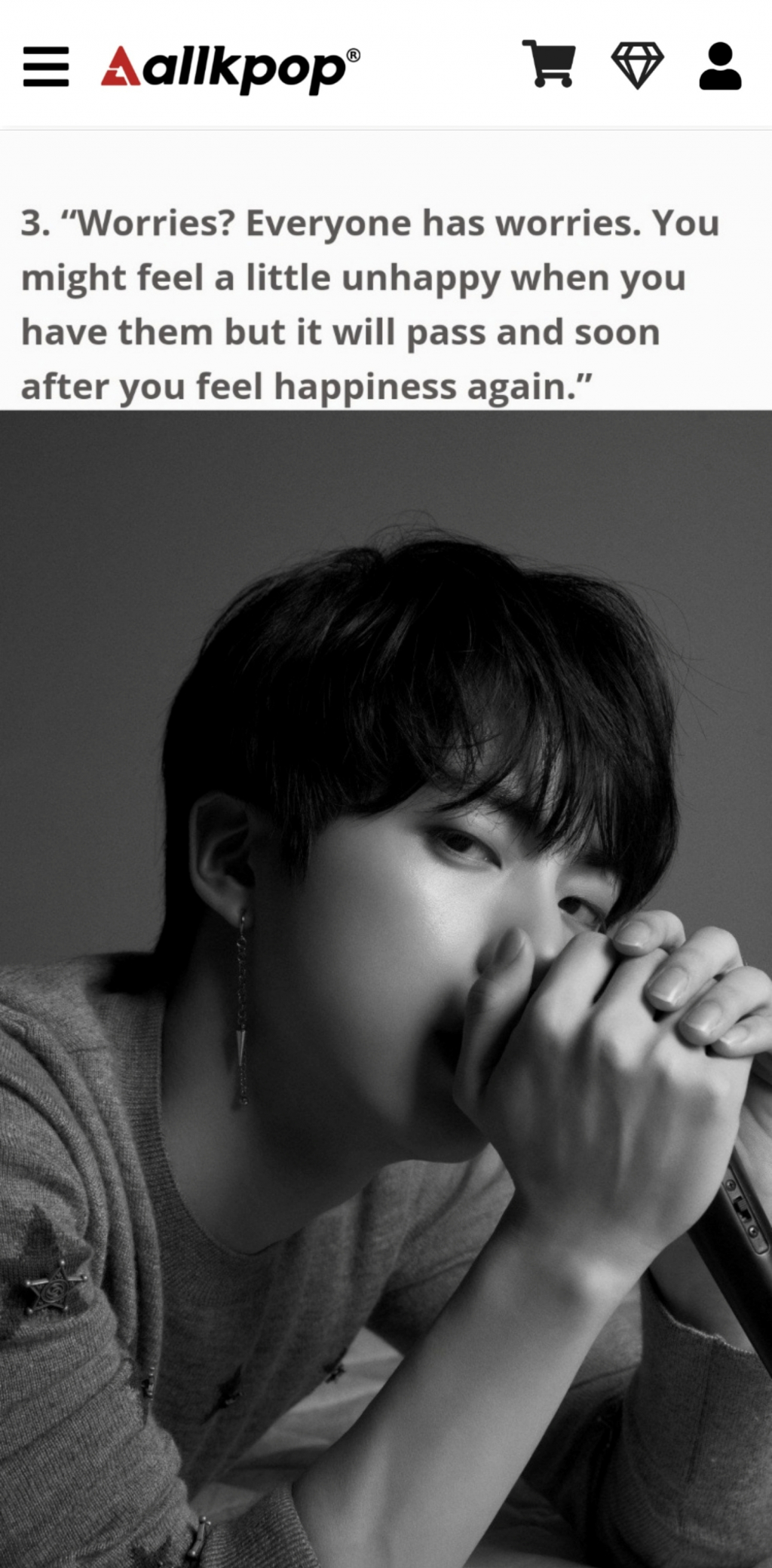 세 번째로 "걱정? 누구나 걱정이 있어요. 걱정이 있을 때는 조금 불행하게 느껴질 수 있지만 곧 지나가고 다시 행복을 느낄 수 있을 것입니다"라는 진의 말을 소개했다.