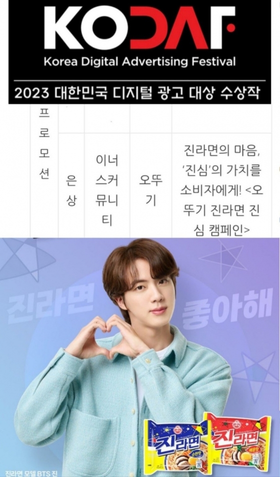 방탄소년단(BTS) 진이 모델인 오뚜기 진라면 광고가 대한민국 디지털 광고대상에서 은상을 수상하며 시선을 집중시켰다.