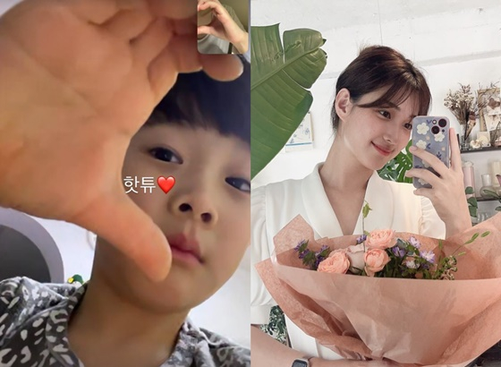 아들과 율희는 화면을 통해 손 하트를 그려내고 있다.