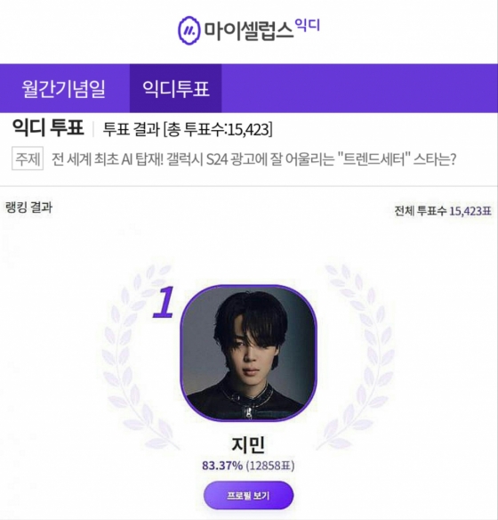 지민은 1월 21일부터 27일까지 익사이팅 디시에서 진행된 '전 세계 최초 AI 탑재! 갤럭시 S24 광고에 잘 어울리는 ''트렌드세터'' 스타는?' 설문에서 1위를 차지했다.