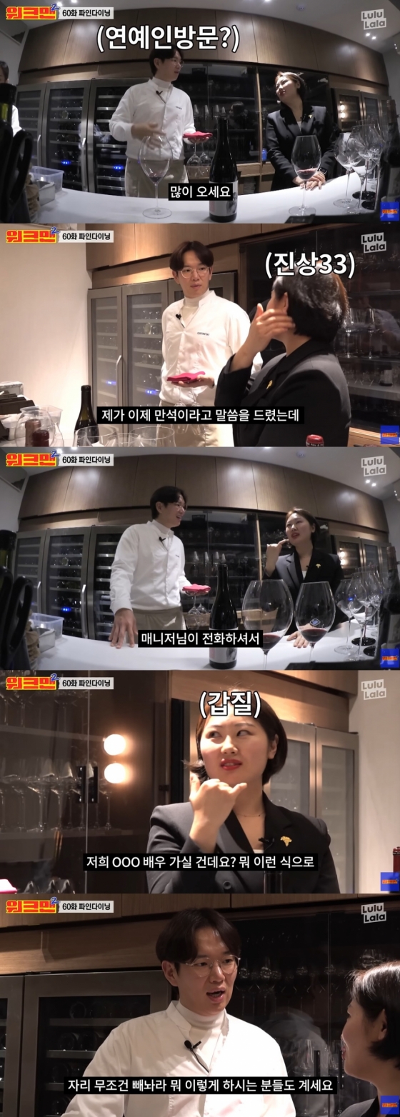 장성규의 궁금증은 계속 이어졌다. 직원은 "연예인들도 많이 오시나요? 진상은 없었나?"라는 장성규의 물음에 "만석이라고 말씀을 드렸는데 매니저님이 전화하셔서 '저희 OOO 배우 가실 건데요?'라는 식으로 '자리 무조건 빼놔라' 이렇게 하시는 분들도 계신다"라고 고백했다.
