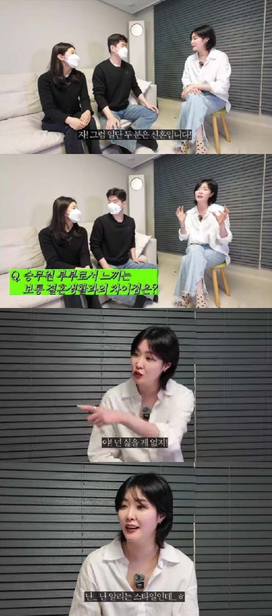 승무원 부부로서 결혼생활에 대해서는 "해외로 많이 나가는 직업이니까 퇴근 시점이 명확하지 않고, 외박도 잦다 보니까 일반 부부들보다 만날 수 있는 시간이 적다"며 "온전히 24시간을 같이 있는 날은 한 달에 이틀 정도다. 다른 날은 밥 한 끼 같이 먹는다"고 말했다.