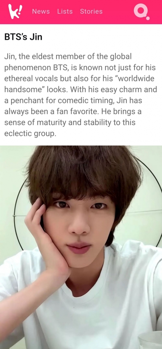 첫 번째는 방탄소년단 진이었다. 코리아부는 글로벌 인기 그룹 방탄소년단의 맏형 진은 천상의 목소리뿐만 아니라 세계 최고 월드와이드 핸섬 미모로도 잘 알려져 있다고 전했다. 또 편안하게 다가오는 매력과 적시적소에 발산되는 재치로 팬들로부터 항상 최고의 사랑을 받아왔다고 말했다.