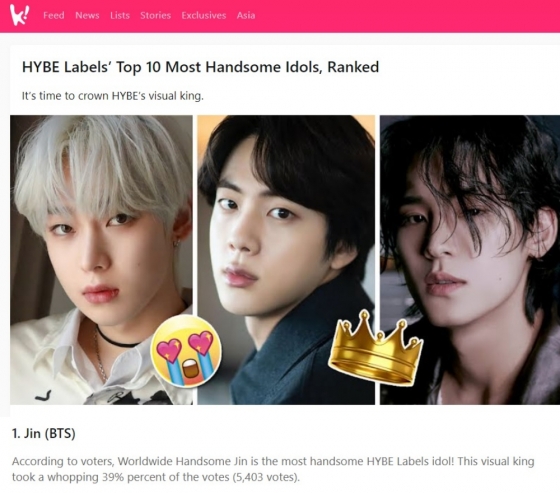 진은 코리아부가 지난해 9월 14일부터 21일까지 진행한 '가장 잘생긴 하이브 아이돌'(The Most Handsome HYBE Labels Idol) 투표에서 1위로 선정됐으며, 인터내셔널 온라인 투표 웹사이트 '피플스 보트'(Peoples Vote)에서 지난해 3월 1일부터 12월 31일까지 진행된 '세계에서 제일 잘생긴 남자 2023' (The Most Handsome Men in the World) 투표에서 1위를 차지하는 등 전 세계의 비주얼 투표를 휩쓸고 있다.