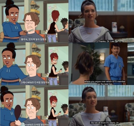 미국 애니메이션 '인생은 언제나 파티!'(Chicago Party Aunt)와 미국 드라마 '천재소녀 두기'(Doogie Kamealoha, M.D.)와 진은 각각 멋진 스타일, 예쁜 입술을 가진 사람의 대표 격으로 언급되며 미국에서도 '최고 비주얼의 상징'임을 증명했으며, 멕시코 드라마 '라 로사 데 과달루페'(La rosa de Guadalupe) 등에서는 진이 '가장 잘생긴 사람'으로 언급되며 전 세계에서 '최고 미남의 대명사'로 통하고 있음을 드러냈다.