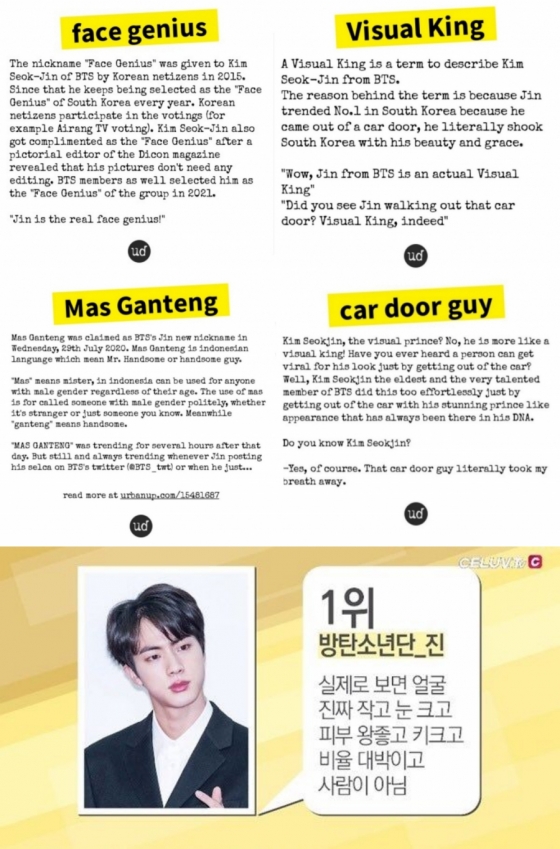 수많은 이용자를 보유한 영미권 사전 사이트인 '어반 딕셔너리'(Urban Dictionary)는 '얼굴 천재(Face Genius)' 항목을 진으로 정의하며 진의 독보적인 미모를 인증하기도 했다. 어반 딕셔너리는 이 외에도 '비주얼킹'(Visual King)', 'car door guy(차문남)', 'Mas Ganteng(마스 간떵, 미남이라는 뜻)' 등 수많은 비주얼 키워드를 진이라고 정의했다.