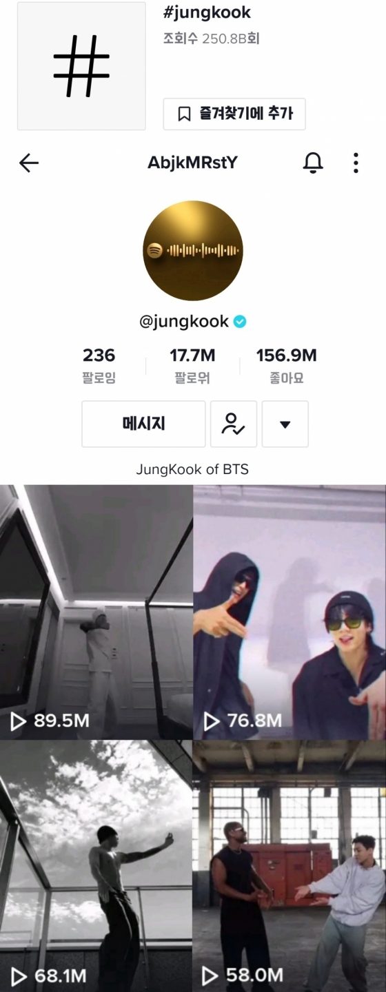 정국은 최근 글로벌 쇼트 비디오 플랫폼 틱톡에서 자신의 고유 명사 개인 해시태그 '#jungkook'으로 조회수 2500억을 달성했다.
