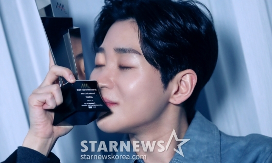 가수 딘딘이 서울 종로구 스타뉴스 사옥에서 진행된 '2023 아시아 아티스트 어워즈 인 필리핀'(2023 Asia Artist Awards IN THE PHILIPPINES, 이하 2023 AAA) 수상 인터뷰에 앞서 포즈를 취하고 있다.