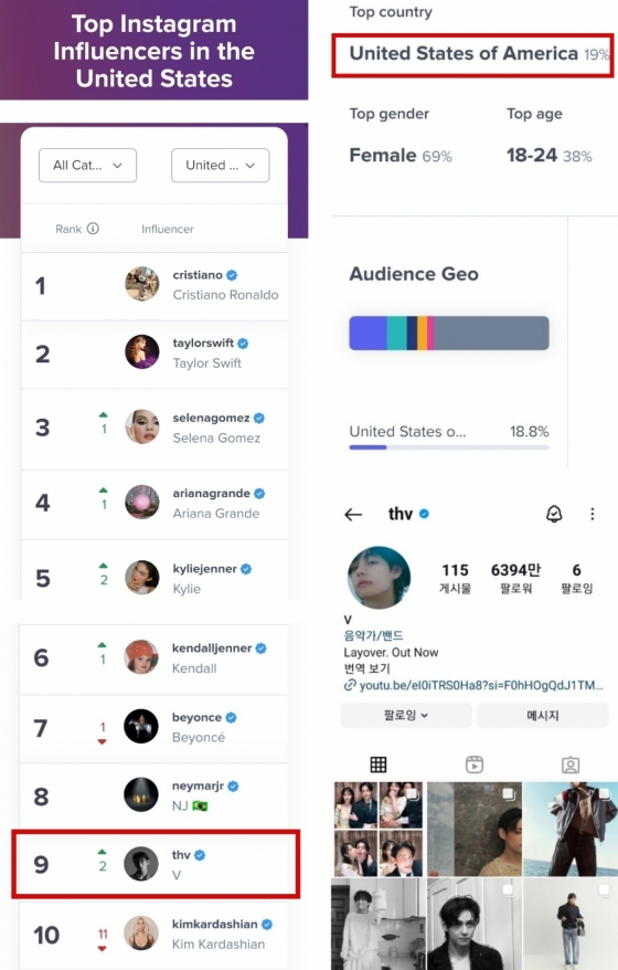 마케팅 전략을 제공하는 분석회사 '하이프오디터'는 2024년 현재 미국에서 가장 인기 있는 인스타그램 계정을 분석한 결과, 뷔가 '미국에서 가장 영향력 있는 인플루언서 톱 1000' 9위에 선정됐다고 발표했다.