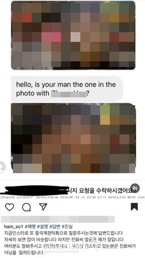 함소원은 지난 12일 자신의 인스타그램을 통해 "지금 인스타로, 또 중국 계정 틱톡으로 질문 주시는 것에 답변드린다. 자세히 보면 아주 비슷하다. 하지만 진화 씨 얼굴은 내가 잘 안다"라며 "여러분도 잘 봐주시고 확인해달라. 사진상 키스하고 있는 분은 진화 씨가 아니다"라고 밝혔다.