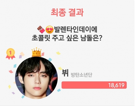 방탄소년단(BTS) 뷔가 '밸런타인데이에 초콜릿 주고 싶은 남자 아이돌' 1위에 오르며 인기를 빛냈다.