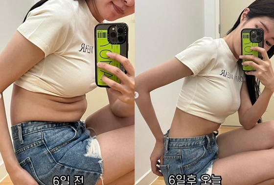 그는 6일 전과 현재의 뱃살을 비교하기도 했다. 포동포동했던 과거와 달리 지금의 미자는 홀쭉한 개미허리를 지니고 있다.