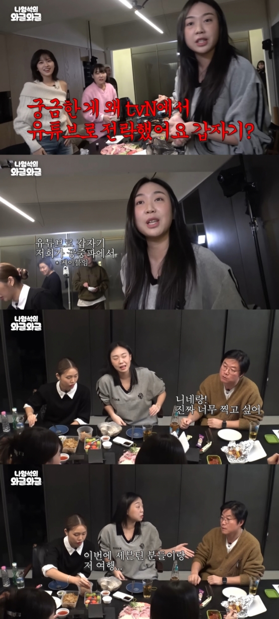 이날 이영지는 "궁금한 게 있는데 왜 tvN에서 유튜브로 전락했나. 내가 너무 궁금해서 그렇다. 우리 이사님이랑 통화할 때 그렇게 미안해하셨다고 하더라"며 "갑자기 공중파에서 우리 유배당하지 않았나. 새 식구가 생겼나"라고 말했다.