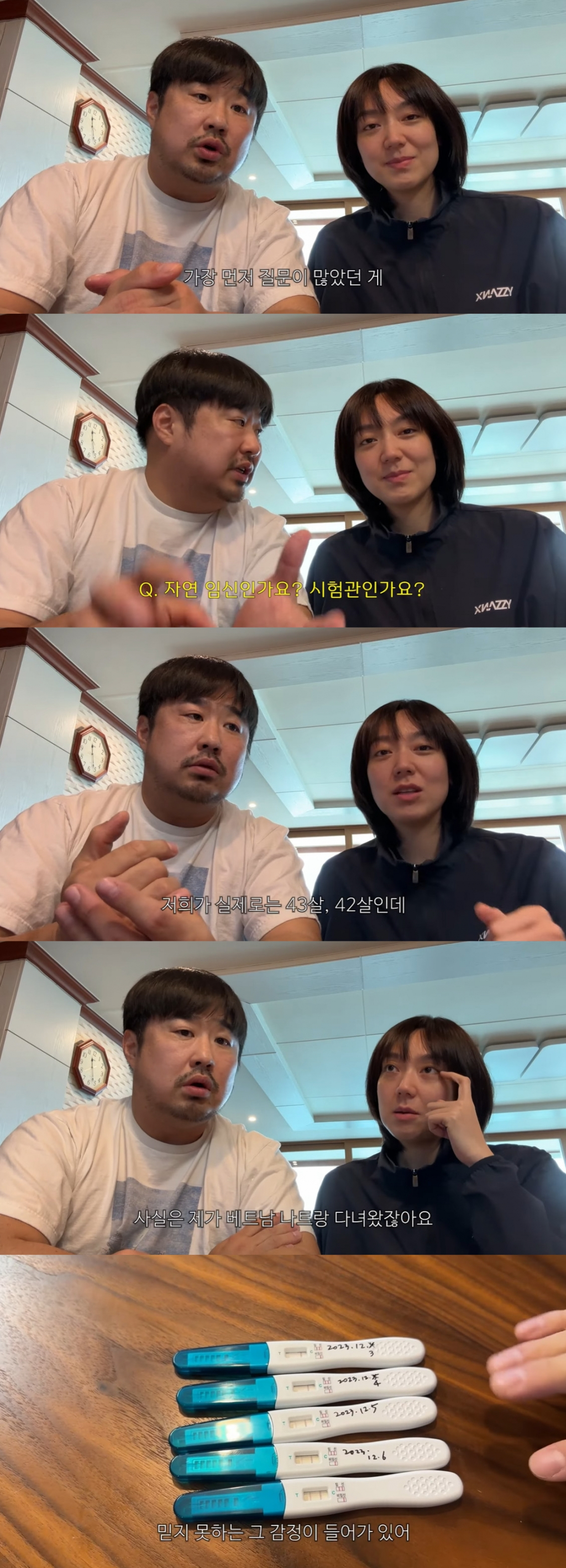 이어 "이때 진짜 놀랐다. 이런 적이 없었다. 다음 날 바로 아침에 첫 소변으로 하는 게 정확하다고 했다. 다음은 확실히 두 줄이었다. 내가 노산이라 걱정을 많이 했다. 다음다음 날 빼도 박도 못하였다. 혹시 모르니까란 생각으로 다음 날 또 했는데 점점 더 진해진다. 다음은 너무 확실했다"라고 전했다.