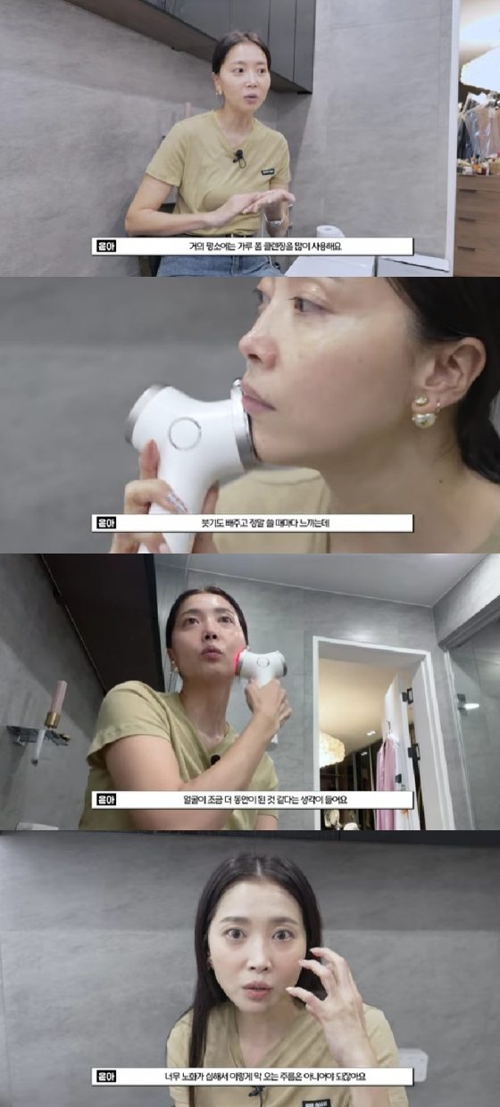 이날 오윤아는 "피부가 붓고, 컨디션이 안 좋으면 홈 케어 기기를 사용한다"며 "붓기도 빼주고 쓸 때마다 느끼는데 이거 할 때랑 안 할 때랑 다르다. 이런 제품들을 많이 사용하면서 얼굴이 동안이 되는 것 같다"고 말했다.