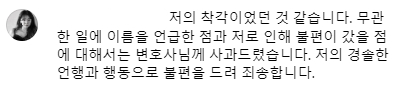 이후 9기 옥순은 구독자만 볼 수 있는 채널을 통해서도 "제가 동의 없이 변호사 친구의 아이디를 공개한 잘못이 있다. 제 여론이 안 좋아서 저랑 친하게 지내는 모습을 보이는 것이 변호사 이미지에 도움 될 것이 없다고 판단한 것"이라며 이 변호사에게 수임을 거부 당하고 환불을 받았다고도 고백, "제가 감당해야 할 건이라고 생각한다. 억측 자제 부탁드린다"라고 전했다.