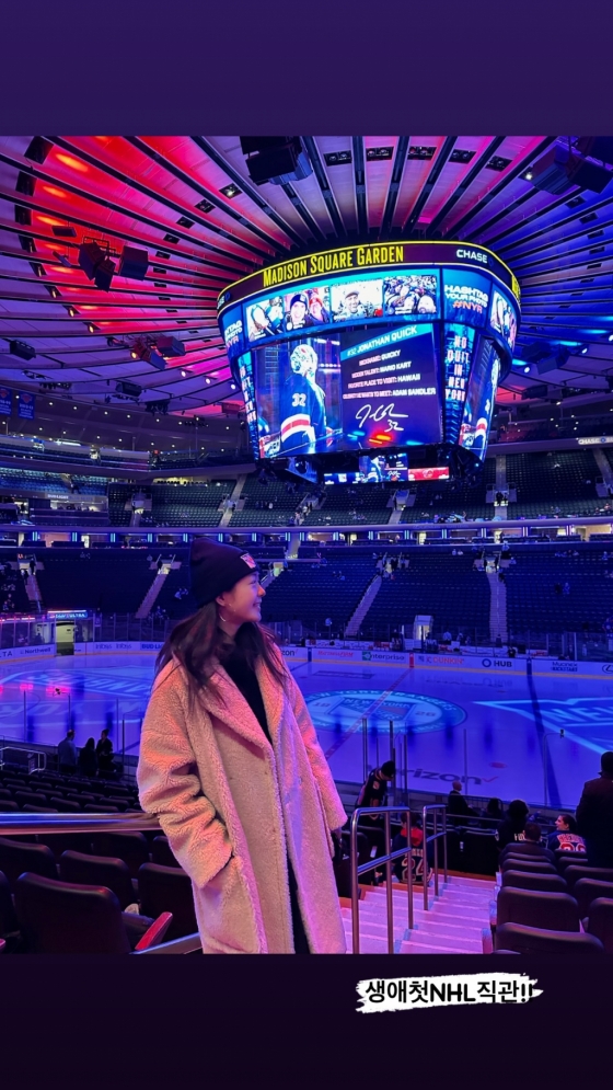 추가 스토리로 업로드된 사진에는 매디슨 스퀘어 가든 경기장을 배경으로 '생애 첫 NHL 직관!!'이라는 글씨와 함께 잔뜩 들떠있는 옆모습이 담겨있어 보는 이들도 웃음 짓게 만들었다.