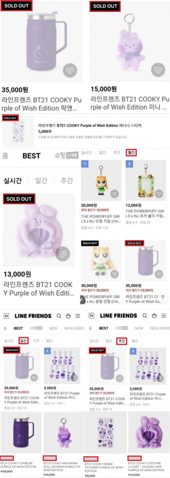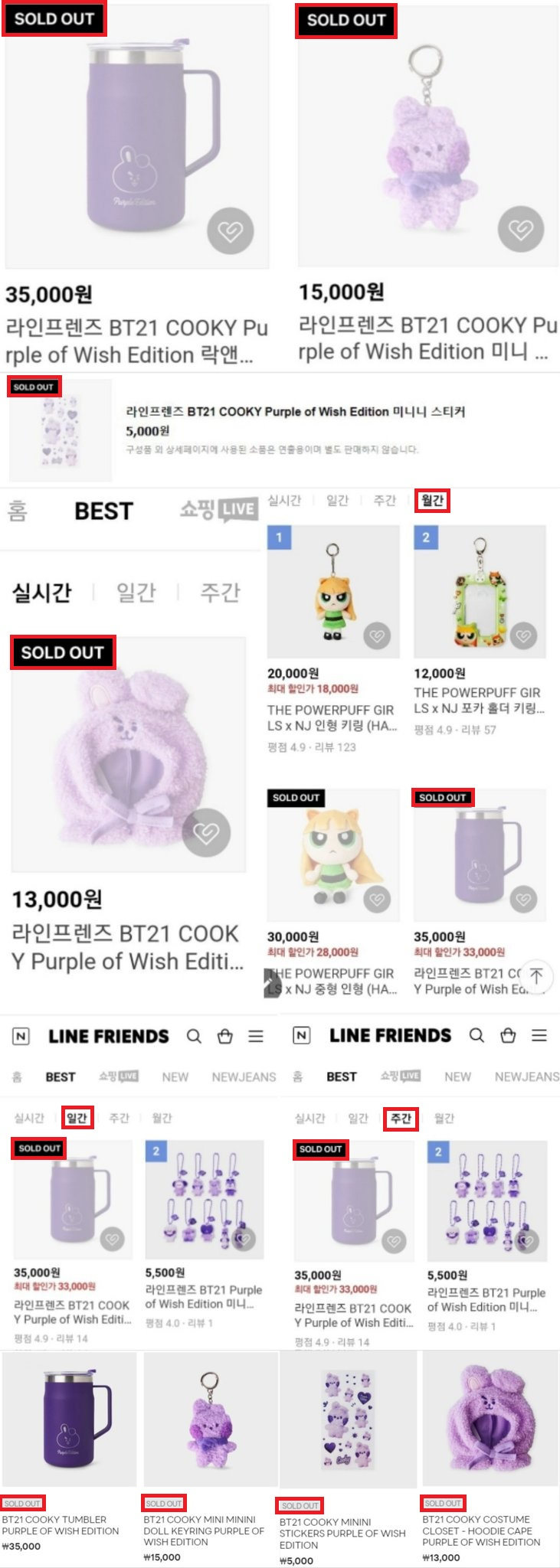 이와 함께 '라인프렌즈 BT21 COOKY Purple of Wish Edition 미니 미니니 버전 인형 키링' 또한 출시 당일 함께 품절됐고, 21일 '라인프렌즈 BT21 COOKY Purple of Wish Edition 클로젯'은 실시간 베스트 1위에 오른 후 품절, '라인프렌즈 BT21 COOKY Purple of Wish Edition 미니니 버전 스티커'도 그 뒤를 이어 품절 행렬에 동참했다.
