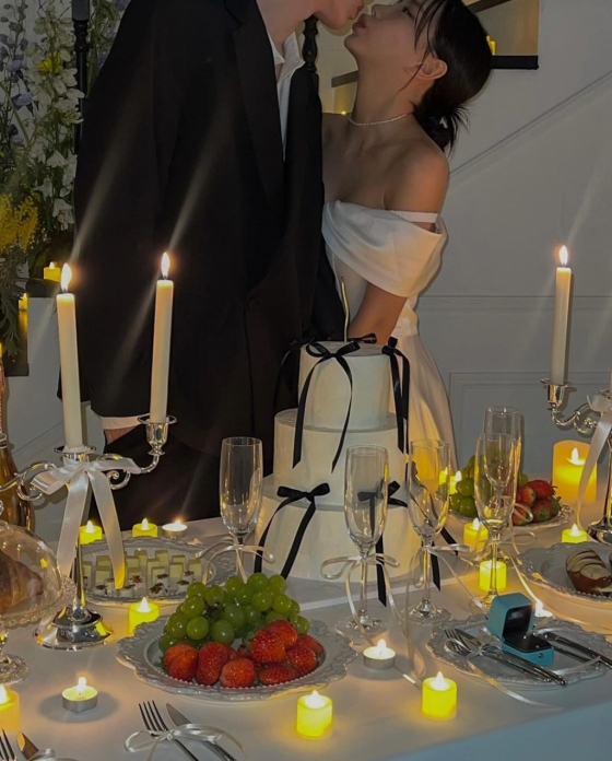 사진 속 한아름송이는 이민석과 지인들이 준비한 한 스튜디오에서 순백의 드레스를 입고 환하게 웃고 있는 모습. 한아름송이는 이민석이 준비한 프러포즈와 반지를 손에 낀 채 예비 신랑과 입을 맞추고 있다.
