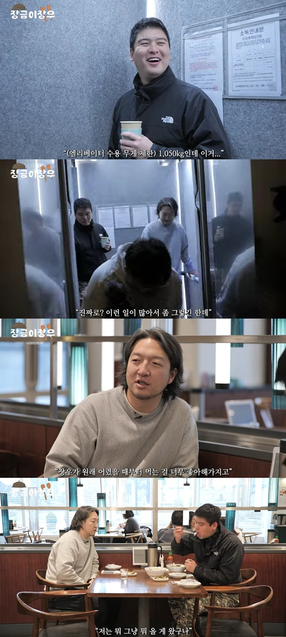 지하로 내려가기 위해 탑승한 엘리베이터에서는 정원 초과 경고음이 울렸다. 이장우는 "이거 1050kg인데"라며 "6명인데 어떻게 1050kg가 넘냐. 13명이 타는 건데"라고 당황해했다.