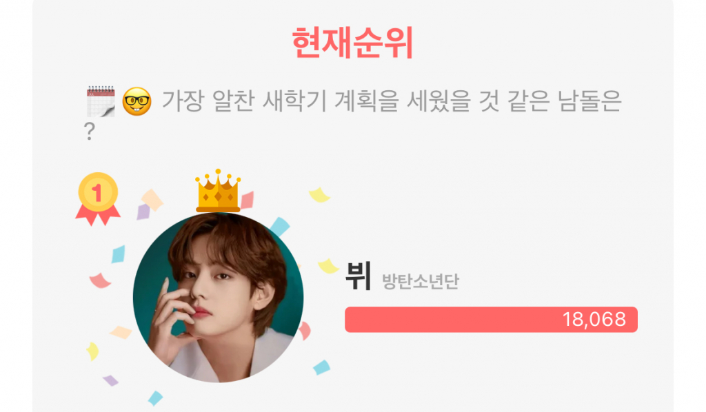 뷔는 아이돌 커뮤니티 '최애돌'에서 2월 22일부터 28일까지 진행한 '가장 알찬 새학기 계획을 세웠을 것 같은 남자 아이돌은?' 설문에서 1위에 올랐다.