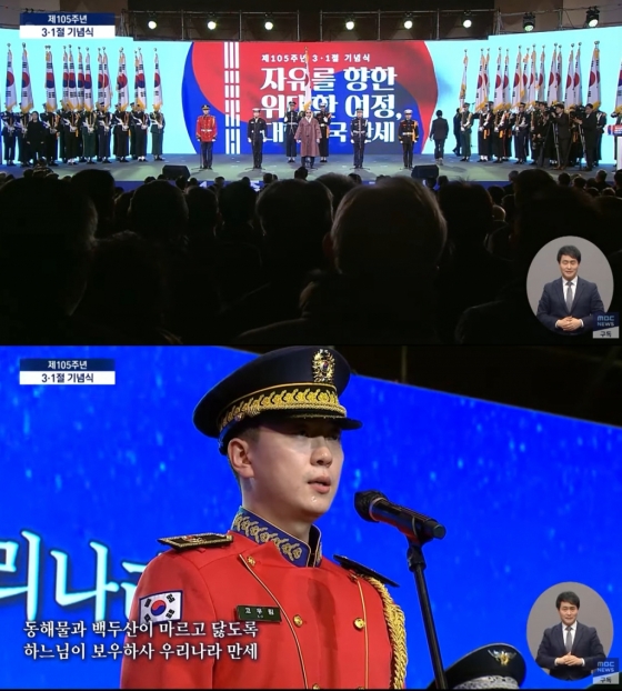 이 자리에는 지난해 11월 육군 군악대로 현역 입대한 고우림의 모습이 포착됐다. 포레스텔라 멤버이자 성악가 겸 크로스오버 가수인 고우림은 빨간 제복을 입고 등장해 늠름한 모습으로 경건하게 애국가를 제창했다. 특히 그는 다소 살이 빠진 듯한 모습으로 눈길을 끌었다.
