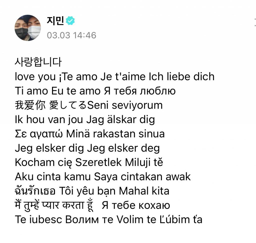 지민은 3월의 첫 휴일인 3일 공식 팬 커뮤니티인 위버스를 통해 '사랑합니다'라며 한국어를 비롯한 영어, 스페인어, 프랑스어, 독일어, 포르투갈어, 러시아어, 중국어, 일본어등 다양한 언어로 팬들에 대한 사랑을 고백해 팬들을 감동시켰다.