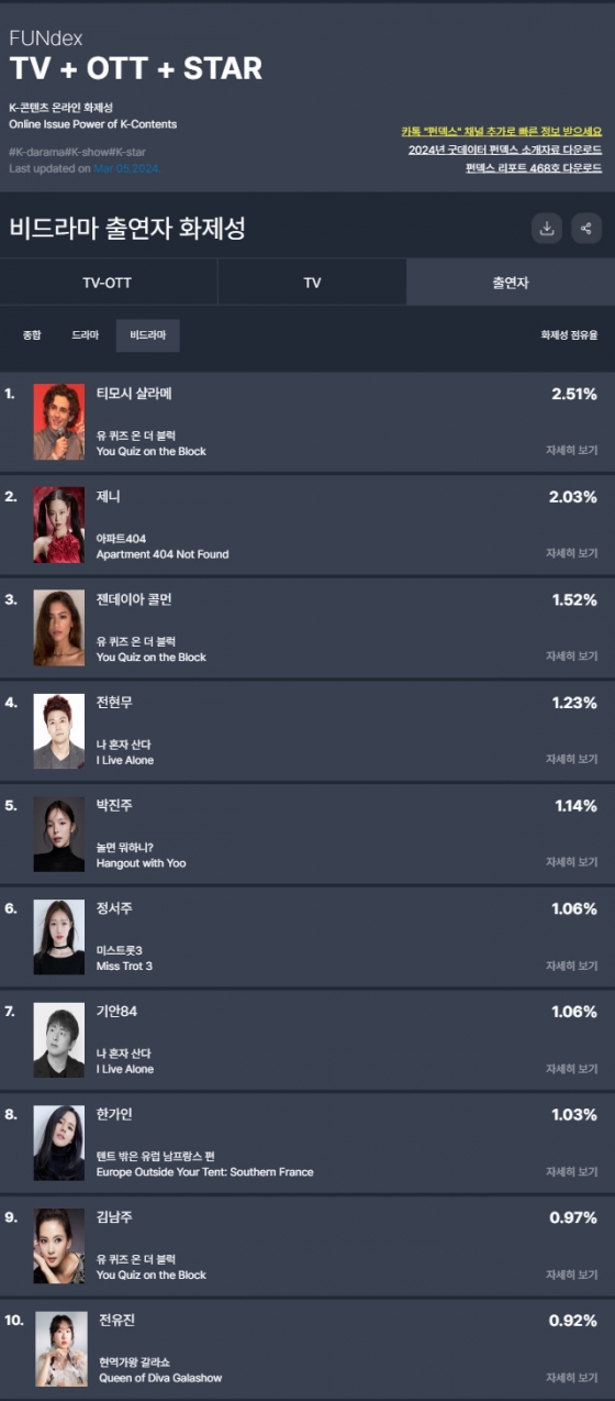K-콘텐츠 경쟁력 분석 전문 기관인 굿데이터코퍼레이션의 공식플랫폼 펀덱스(www.fundex.co.kr)에서 3월 5일에 발표한 이번 순위는 2024년 2월 26일부터 3월 3일까지 방송 또는 공개 중이거나 예정인 TV비드라마와 OTT 오리지널 비드라마 그리고 각 프로그램에 출연한 출연자과 게스트를 조사 대상에 포함하였다.