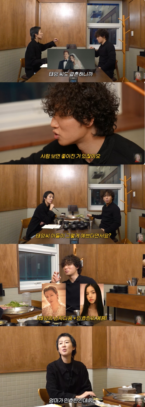 홍진경은 같은 그룹 빅뱅의 멤버이자 배우 민효린과 2018년 결혼한 태양을 언급하며 "태양 씨도 결혼하니까 훨씬 좋다고 하냐"라고 물었다. 이에 대성은 "훨씬 좋다고 한다. 태양 형 보면 좋아진 게 보인다"라고 했다. PD의 "태양 씨 아들이 그렇게 예쁘다면서요"라는 질문에는 "맞다. 형의 남자다움과 민효린 형수님의 예쁨을 최고로 딱 잘 가져온 아이인 것 같다"라며 태양 아들의 외모를 칭찬했다.