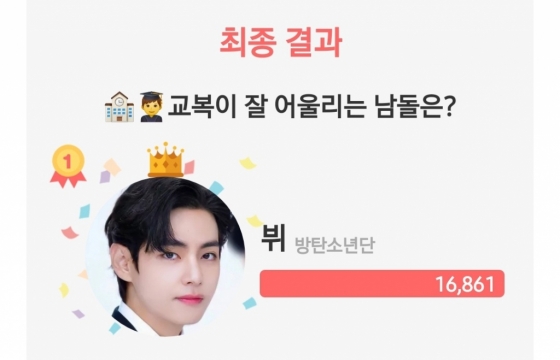 방탄소년단(BTS) 뷔가 교복이 잘 어울리는 남자 아이돌 1위에 오르며 인기를 빛냈따.