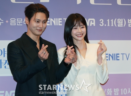 배우 주원, 권나라가 11일 오후 서울 마포구 상암동 스탠포드 호텔에서 진행된 지니TV 새 드라마 '야한 사진관' 제작발표회에 참석해 포즈를 취하고 있다.
