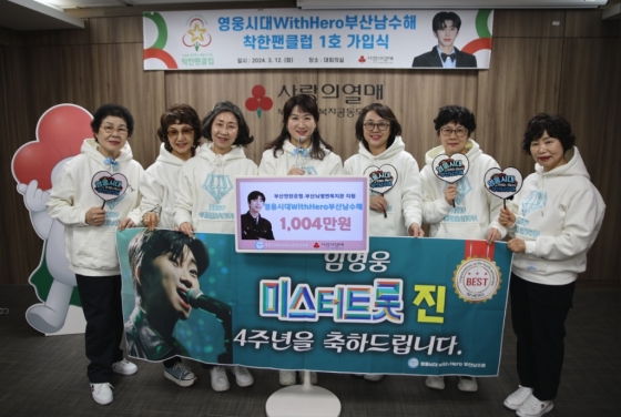 임영웅은 팬클럽 '영웅시대 With Hero 부산남수해'는 3월 14일 임영웅의 '미스터 트롯' 진 등극 4주년을 기념해 부산 사랑의열매(회장 최금식)에 1004만 원을 기부했다.