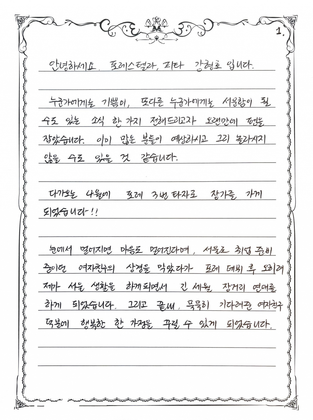 강형호는 12일 포레스텔라 공식 팬카페에 손편지를 올리고 결혼을 발표했다. 그는 "누군가에게는 기쁨이, 또다른 누군가에게는 서운함이 될 수도 있는 소식 한 가지 전해드리고자 오랜만에 펜을 잡았다. 이미 많은 분들이 예상하시고 그리 놀라시지 않을 수도 있을 것 같다"라며 글을 적었다.