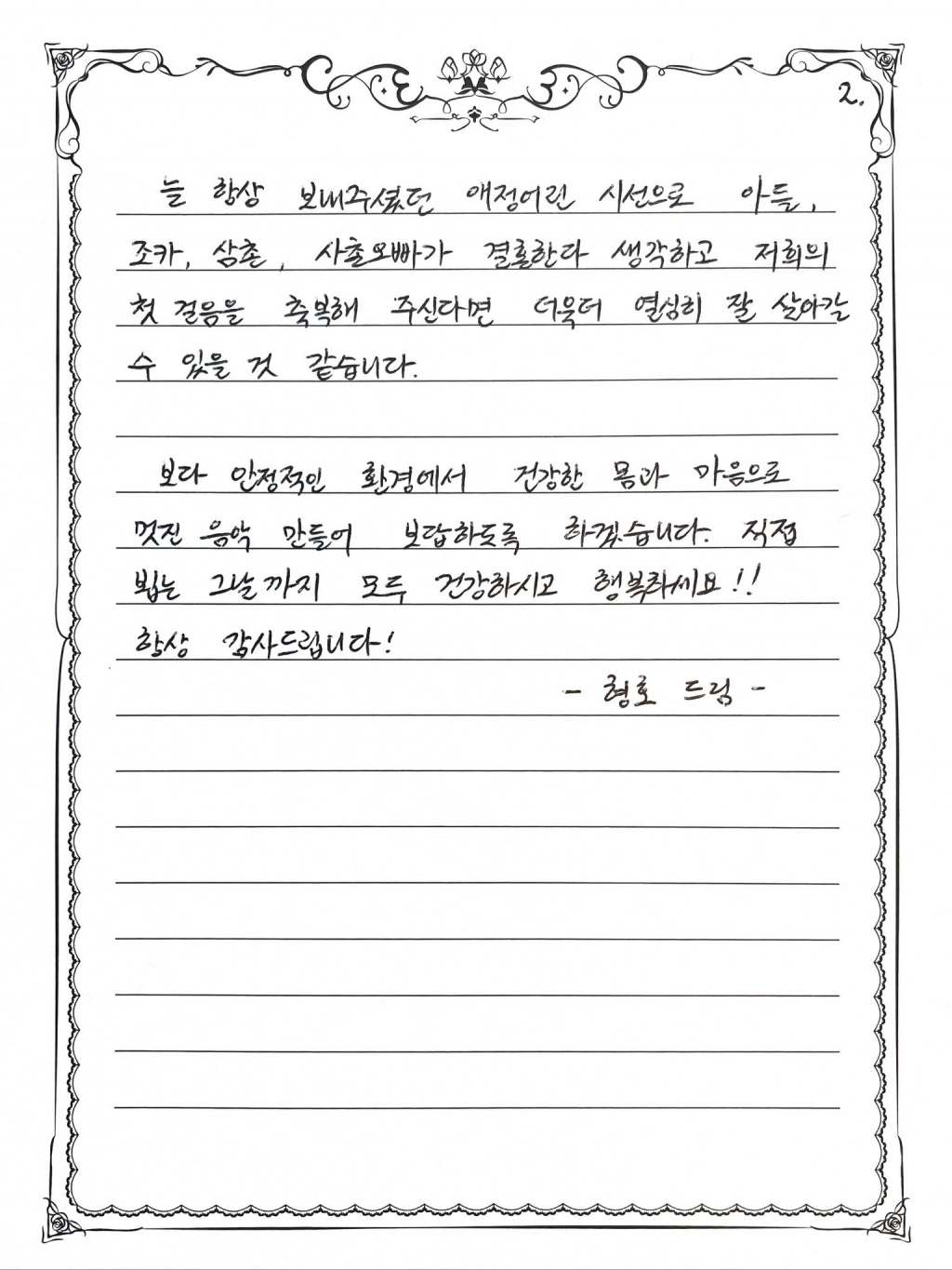 또한 "늘 항상 보내주셨던 애정어린 시선으로 아들, 조카, 삼촌, 사촌오빠가 결혼한다 생각하고 저희의 첫 걸음을 축복해 주신다면 더욱더 열심히 잘 살아갈 수 있을 것 같다"고 전했다.