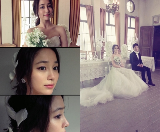 웨딩 드레스를 입은 이민정과 정장을 입은 신하균이 촬영장에서 환하게 웃고 있다. 두 사람의 풋풋한 모습도 돋보여 이목을 끈다.