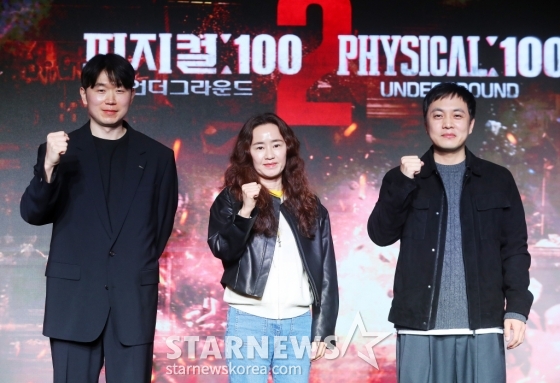 장호기 PD, 강숙경 작가, 이종일 PD가 14일 오전 서울 마포구 호텔 나루 서울 엠갤러리에서 진행된 넷플릭스 오리지널 예능 '피지컬: 100 시즌2-언더그라운드' 제작발표회에 참석해 포즈를 취하고 있다.