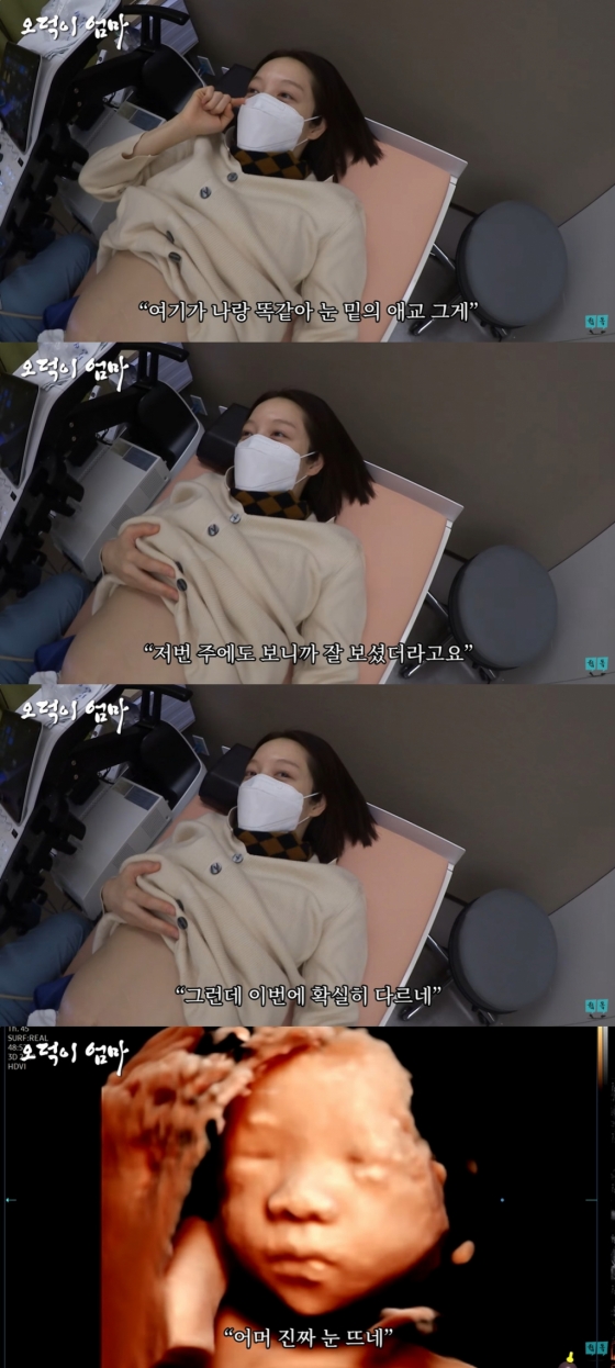 초음파로 뱃속을 확인한 황보라는 좀 더 큰 아기와 만났다. 그는 "눈매가 나랑 똑같다. 이번에 확실히 자랐다. 귀도 엄청나게 크고 입도 벌린다. 눈도 뜬다. 어머 어떡해... 안에서도 눈을 뜨고 다 한다. 오물오물한다. 저번보다 훨씬 잘 보인다"라고 감탄했다.