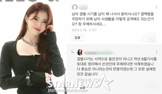 "좋은 감정을 가지고 관계를 이어 나가는 사이는 맞습니다 그치만 환승이라는 단어는 배제해 주셨으면 해요. 사진전을 통해 만난건 사실이지만 그것은 포토그래퍼인 제 친구를 통해 전시관람을 목적으로 간것이고 같이 작품을 하게 될수도 있다는 소식을 듣게 되어서 인사차 들리게 된 것입니다. 서로 마음을 주고 받았던 당시는 이미 2024년의 시작이였고 그분과의 이별은 2023년 초에 마무리가 되었고 결별기사는 11월에 나왔다라고 들은 바가 있습니다 이 사실을 토대로 저는 제 마음을 확인하고 관계를 지속했습니다."